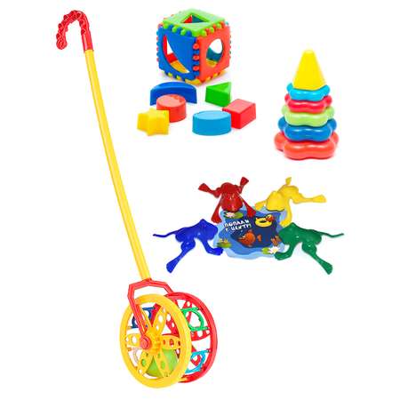 В детский развивающий набор для малышей 4 в 1 входит: Каталка с ручкой Колесо + Кубик сортер логический малый + Пирамидка детская малая + Игрушки лягушки. Каталка детская с ручкой Колесо яркая и веселая, с удобной ручкой. При качении каталка трещит и внутри ажурного барабана перекатывается шарик, который создает дополнительный шум. Игрушка состоит барабана-колеса и длинной рукояти, заканчивающейся удобной ручкой, за которую ребенку будет комфортно держаться. Поможет делать первые шаги, держать равновесие и бегать. Размер: 620х80х130 мм. Вес: 110 гр.