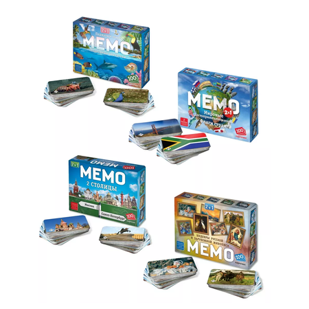 Настольные карточные развивающие игры Мемо. В набор из 4-х игр 2 в 1 входят: "Пернатый мир и Подводные обитатели", "Мировые достопримечательности и Флаги стран", "Две Столицы", "Шедевры русской и зарубежной живописи". Каждая игра состоит из карточек с парными изображениями. Всего 25 пар (50 карточек). Вы и не заметите, как запомните всё, что изображено на карточках. Это игра расширяет кругозор, развивает внимание и память. В комплекте буклет с описанием всех мест, изображённых на карточках. Наверняка, вы узнаете много нового. "Мемо" всегда хороший подарок как для мальчиков, так и для девочек. Правила игры: Перед началом игры карточки перемешиваются и раскладываются на столе картинками вниз. Играют несколько игроков. В свой ход игрок переворачивает 2 любые карточки и показывает их остальным игрокам. Если карточки одинаковые, игрок забирает их себе и делает еще один ход. Если разные - переворачивает их и кладет обратно, а ход переходит к следующему игроку. Выигрывает игрок, собравший к концу игры наибольшее количество карточек. Мемо - это настольные игры не только для детей, но и для взрослых, для всей семьи, для компаний, для пар. Это игры на развитие памяти, развивающие игры для школьников, умные игры. Можно играть как дома, так и взять игру в дорогу. Подойдет как оригинальный подарок в школу, детям в детский сад, на подарок подростку, друзьям, коллегам, другу, подруге. Как подарок на день рождения, на 23 февраля, на 8 марта, как новогодний подарок или просто так. Игра мемо подходит как настольные игры для детей, развивающие игрушки для малышей, семейные игры, детские игры, игры в дорогу, подарки детям в сад, логические игры, игры для пар, это прикольные подарки, настольные игры для компании, подарки детям. Мемо могут подойти тем, кто любит играть в такие настольные игры, как уно, мухобойка, монополия, спящие королевы, какой ты мем, мафия, гномы вредители и другие. Страна производитель: Россия. Упаковка: Картонная коробка. Размер карточки 9х6,3 см. Возраст 5+.