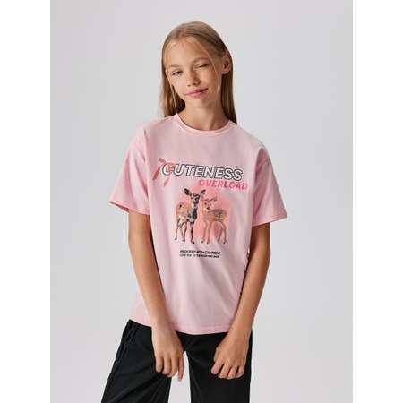 Розовая детская футболка с принтом оленят для девочки-подростка изготовлена из приятного на ощупь хлопкового полотна. Модель COMFORT fit отличается свободным кроем для более комфортного ношения. В футболке приспущена линия плеча, а также увеличены объем и длина рукава, что дарит свободу и легкость движений. Спереди модель украшена изображением оленят, нарисованным бантиком и надписями: "CUTENESS OVERLOAD | PROCEED WITH CAUTION! | LOVE YOU TO THE MOON AND BACK" [англ. - "Перегрузка милотой | Действуй осторожно! | Люблю тебя до луны и обратно" ]. Нежная и очаровательная, футболка для девочки преобразит любой лук, добавляя ему девичьего шарма. Футболка представлена в нескольких цветах. Добавьте к модели брюки со шнуровкой (20240460013), чтобы получить стильный повседневный лук.