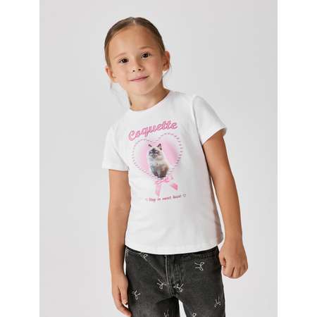 Детская футболка с котиком для девочки изготовлена из кулирной глади, которая отличается своей мягкостью и воздушностью. Модель силуэта REGULAR fit — традиционная посадка по фигуре, отличающаяся прямым силуэтом, а также стандартной линией плеч и длиной рукава. Спереди нанесен принт с изображением милого котика в сердечке из жемчужин и надписями "COQUETTE" [фр. - "Кокетка"] и "STAY IN SWEET HEART" [англ. - "Оставайся с добрым сердцем"]. Принт на водной основе не выцветает и не трескается при стирках, а значит, будет долгое время радовать своими красками. Стильная и нежная футболка составит прекрасный девичий образ на каждый день с любимыми джинсами или юбкой.