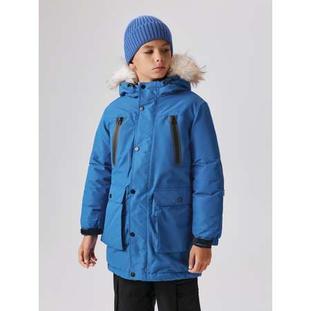 Утеплённое пальто с капюшоном для мальчика — это стильная и современная модель для уютного ношения в холодное время года. Мембранная ткань с показателями 5000/5000 и водоотталкивающей пропиткой обеспечивает надежную защиту от промокания. Ткань не только не пропускает влагу снаружи, но и не позволяет испарениям оставаться внутри, что обеспечивает максимально комфортное ношение. Проклеенные швы дополнительно защищают от дождя и мокрого снега. Утеплитель — синтепон (вес 250гр/м2) делает комфортным ношение при температуре от -5 до -30 градусов. Подкладка для тела и капюшона выполнена из флиса, в рукавах стандартная подкладочная ткань. Спереди расположена застёжка на молнию с защитой от защемления подбородка, а также внешней и внутренней ветрозащитными планками; внешняя планка застегивается на кнопки. Спереди нашиты два накладных кармана с клапанами, а также на груди расположены карманы на водонепроницаемой молнии. Несъемный капюшон с отстегивающимся мехом укроет ребенка от ветра и непогоды. Рукава дополнены трикотажными манжетами с дыркой для большого пальца, что предотвращает продувание, а снаружи ширина рукава регулируется патой на липучке. По талии изнутри расположена утяжка, позволяющая подогнать куртку по фигуре. Светоотражающие принты на спинке и рукавах уберегут ребенка от машин в темное время суток. Синее утепленное пальто для мальчика станет лучшим выбором для холодного времени года.