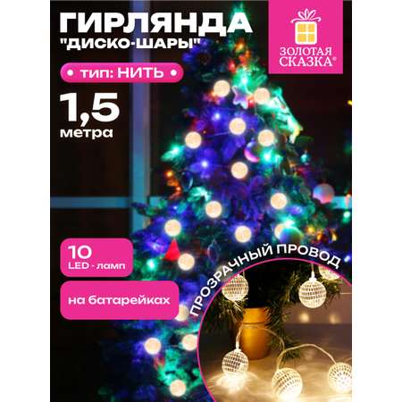 "Электрогирлянда-нить комнатная ""Диско-шары"" от ЗОЛОТАЯ СКАЗКА – идеальный новогодний декор для комнаты и елки, который подарит уют и праздничное настроение в Новый год 2026. Светодиодные шарики диаметром 4 см излучают теплый белый свет, создавая мягкую и волшебную атмосферу в доме и офисе. Эта новогодняя гирлянда нить длиной 1,5 м с 10 LED лампами безопасна и экономична, работает от 2 батареек AA, что делает ее удобной для украшения комнат без лишних проводов. Используйте её как стильное украшение для дома и на елку или в качестве оригинального подарка, чтобы обновить новогодние украшения и добавить яркие акценты в интерьер. Отличный выбор для создания праздничного настроения и теплого декора в комнате!
