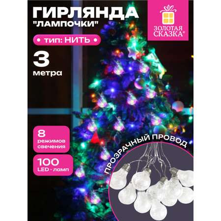 "Электрогирлянда-нить комнатная ""Лампочки"" длиной 3 метра с 100 LED от ЗОЛОТАЯ СКАЗКА станет идеальным новогодним декором для дома и украшением комнаты в праздники. Мультицветная гирлянда с 8 режимами свечения создаст уют и волшебную атмосферу, подчеркивая новогодние украшения для дома и декор для комнаты. Благодаря последовательному соединению лампочек и качественным материалам, гирлянда новогодняя интерьерная выдерживает 220V и оснащена контроллером для переключения режимов. Это универсальный подарок, который прекрасно впишется в декор комнаты, добавив яркости и тепла в Новый год 2026. Используйте гирлянду дома для создания праздничного настроения и подчеркните стиль домашнего или офисного интерьера с помощью гирлянды нити. Отличный выбор для тех, кто ценит качественные новогодние украшения!