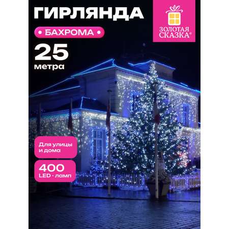 "Электрогирлянда уличная бахрома от ЗОЛОТАЯ СКАЗКА — идеальное новогоднее украшение для дома и улицы в Новый год 2026. Эта гирлянда уличная с лампочками холодного белого цвета создаст уютный и стильный новогодний декор благодаря 400 светодиодам на длине 25х0,7 м. Благодаря влагозащите IP44 гирлянда уличная бахрома отлично подходит для использования вне помещений. Контроллер с 8 режимами свечения позволяет легко выбрать эффект, создавая праздничное настроение. Такой новогодний декор — яркое и современное решение для праздничного оформления дома и улицы, дачи и сада, которое прослужит долго и безопасно благодаря LED технологии. Подарите своему дому атмосферу праздника с этой новогодней гирляндой бахромой!