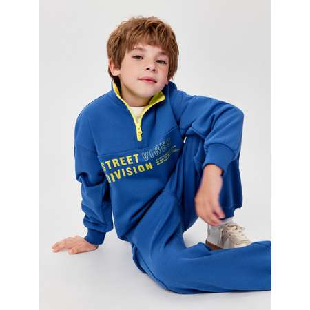 Детский синий анорак для мальчика выполнен из футера с небольшим мягким начесом внутри, который обеспечивает тепло и комфорт. Джемпер модели COMFORT fit отличается свободным кроем для более комфортного ношения. В джемпере приспущена линия плеча, а также увеличен объем рукава, что дарит свободу движений и удобную посадку. Стильный анорак сочетает в себе основной васильковый цвет с яркой желтой отделкой. Спереди расположена короткая застежка-молния, позволяющая быстро и легко одеваться. Воротник-стойка с контрастной внутренней отделкой закрывает горло. По центру расположен принт с надписью "STREET VIBES DIVISION | IT'S MY FAVORITE SPORT AND MY REAL PASSION IN LIFE BREAK THE LIMITS OF REALITY" [англ. - "Лига уличных вайбов | Это мой любимый спорт и моя настоящая страсть к жизни сломает границы реальности"]. Низ изделия и рукавов выполнен в виде эластичных рибовых манжет, что обеспечивает плотное прилегание и отличное сохранение тепла. Стильный и яркий, джемпер с воторником-стойкой для подростка станет оригинальной частью детского гардероба.