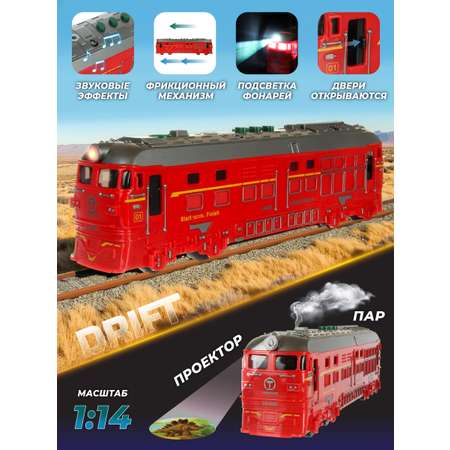 Детский игрушечный поезд со светом, звуком, функцией подачи пара и проектором. Обладает фрикционным механизмом и подвижными элементами, звуки гудка и стука колес, проекция цветных изображений. Реалистичный дизайн, отличное качество исполнения, прочные и долговечные материалы, внимание к деталям.