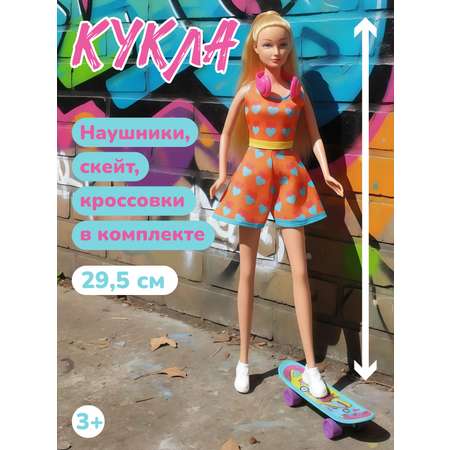 Игровой набор «На прогулке» станет замечательным подарком для девочки на день рождения, Новый год или 8 марта. В нем есть не только стильно одетая куколка в стиле барби, но и игровые аксессуары, которые делают процесс игры увлекательным и разнообразным. В комплект входят кукла с одеждой, наушники, скейт и пара обуви в виде кроссовок. Такой набор отлично подойдет для детской игры в садике или дома.