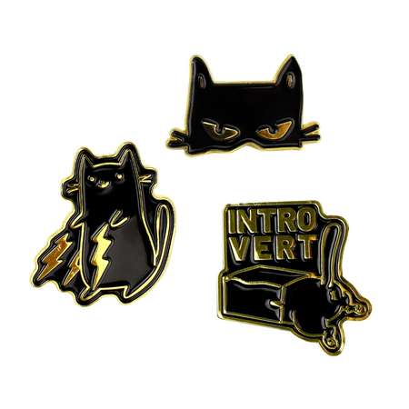 Значки-пины арт. 71128 / 50 Три кота ( 3 шт. в наборе; размер значка/-ов: 29х29/30х29/19х29 мм, материал значка/-ов: металл; способ изготовления: штамповка тип застёжки: цанга-бабочка (игла с заглушкой); цвет: золотистый, чёрный; декор: эмаль холодная (мягкая); индивидуальная упаковка: подложка с европодвесом из мелованного картона + ПЭТ-пакет)