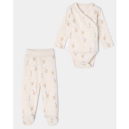 Бежевый комплект для мальчика Моя Горошинка из боди-кимоно и ползунков, декорированных принтом с коалами.