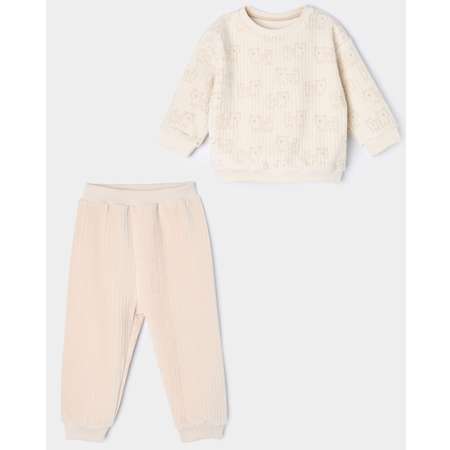 Велюровый бежевый комплект для мальчика Моя Горошинка из однотонных брюк в рубчик и свитшота с тигрятами.
