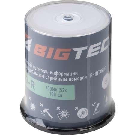 Носители информации Bigtech YCDRP001 CD-R 700МБ Printable 52x 100шт/уп cake
