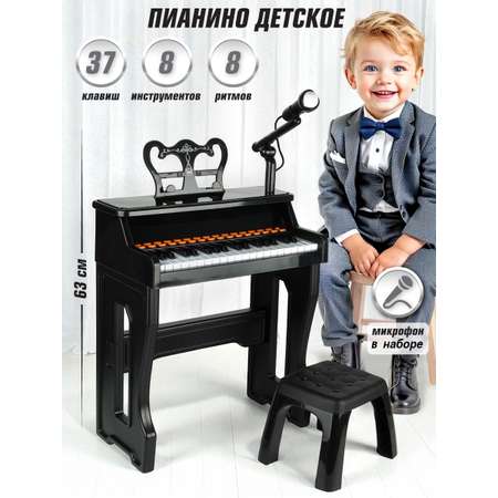 Игрушечное пианино с микрофоном, подставкой под ноты и множеством функций. Работает от батареек, 37 клавиш, пианино проигрывает более 3 мелодий, регулировка скорости темпа, уровня громкости, добавление звуков других инструментов, 8 тембров, 8 аккомпанементов. Запись и проигрывание мелодий, звуки ударных, возможность подключения телефона. Развивающая игрушка изготовлена из прочных и безопасных материалов, прослужит много лет. Детское пианино оформлено в классическом дизайне и расцветке.