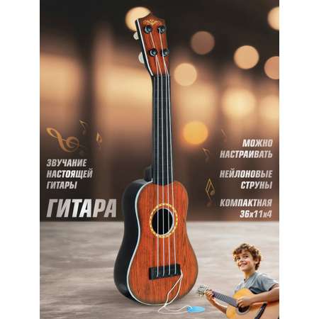 Игрушечная гитара в классическом дизайне с медиатором. Нейлоновые струны, мягко для детских пальчиков, настройка инструмента, мелодичное звучание настоящей гитары. Игрушка гитара изготовлена из прочных и долговечных материалов, отличается хорошим качеством исполнения. Детскую гитару благодаря компактным размерам удобно держать в руках. Детская игрушка станет замечательным подарком мальчику и девочке на Новый год и День рождения, музыкальная игрушка поможет ребенку взять первые аккорды и придумать собственные композиции.