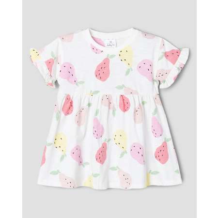 Белое платье для девочки BabyGо, декорированное цветным принтом и оборками на рукавах.