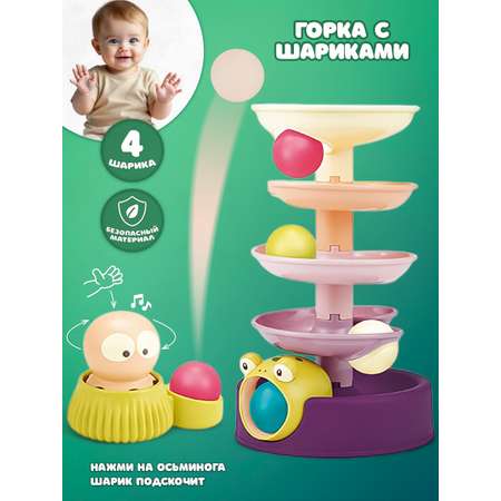 Развивающая игрушка для малышей горка спиралька с шариками, вращающийся с щелчком осьминог катапульта. Игра на ловкость и меткость, нужно попасть шариком из катапульты на верхний ярус горки. Обладает простым принципом работы и легкой сборкой. Округлые, безопасные для ребёнка детали. Развивашка изготовлена из прочных и долговечных материалов. Оформлена в оригинальном дизайне и красивой расцветке. Комплектация. Детали для сборки горки, катапульта,4 шарика.