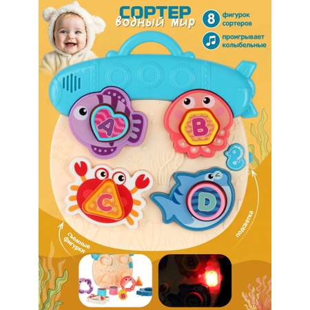 Игрушка сортер для раннего развития ребенка. Детская игрушка проигрывает более 3 колыбельных, эффектная подсветка, сортеры, которым нужно подобрать свое место, знакомство с геометрическими фигурами, цветами, буквами английского алфавита, морскими обитателями. Развивашка имеет округлые формы, безопасно для ребенка, компактные размеры, удобно взять с собой.