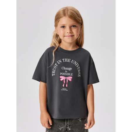 Детская футболка с принтом для девочки выполнена из дышащего трикотажного полотна, которое обеспечивает комфортное ношение на протяжении всего дня. Модель посадки comfort предполагает свободный прямой силуэт, приспущенную линия плеча, а также чуть увеличенные длину и объём рукава. Такой крой дарит легкость движений, которая особенно важна для активных девочек. Удобная горловина округлой формы не мешает при одевании. Спереди расположен принт с изображением бантика и надписями "TRUST IN THE UNIVERSE | CHANGE IS POSSIBLE | THE BEST IS YET TO COME" [англ. - "Доверься Вселенной | Перемены возможны | Лучшее ещё впереди"], который настраивает на позитивный лад. Стилизуйте футболку в повседневном образе с джинсами или брюками для создания модного образа.
