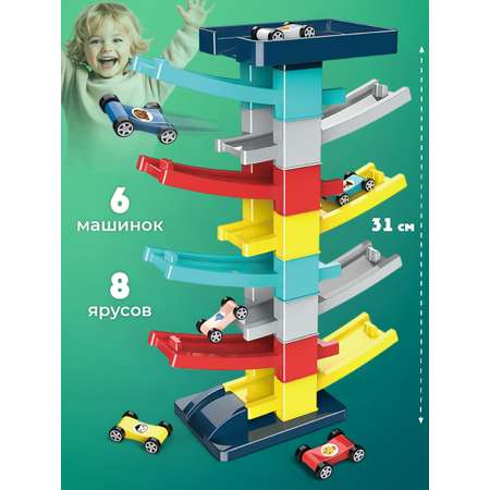 Вертикальный трек с машинками в оригинальном дизайне. Горка для машинок обладает легкой сборкой, 8 ярусов, машинка скатывается с яруса на ярус, 2 площадки для машинок. Компактные машинки разных цветов в наборе, изучение цвета, счета, наклейки с мордочками животных, знакомство с ними, можно играть одному и компанией. Детский игровой набор изготовлен из прочных и долговечных материалов, отличается качественным исполнением. Горка с машинками станет замечательным подарком для детей на Новый год и День рождения.