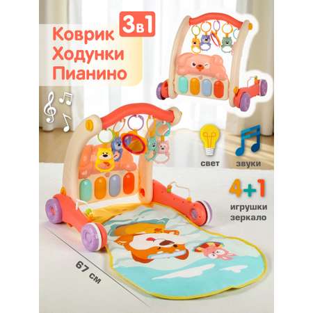 3 в 1, ходунки, коврик, пианино. Можно снять коврик, получатся ходунки, ребёнок будет учиться ходить, коврик можно использовать отдельно, пианино можно использовать отдельно, у ходунков удобная для хвата ручка. Съёмные игрушки погремушки и зеркало. Многофункциональный развивающий центр оформлен в милом дизайне и приятной расцветке. Игровой коврик для новорожденного изготовлен из безопасных и долговечных материалов.