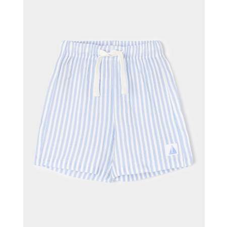 Текстильные шорты для мальчика BabyGo в голубую полоску, декорированные нашивкой.