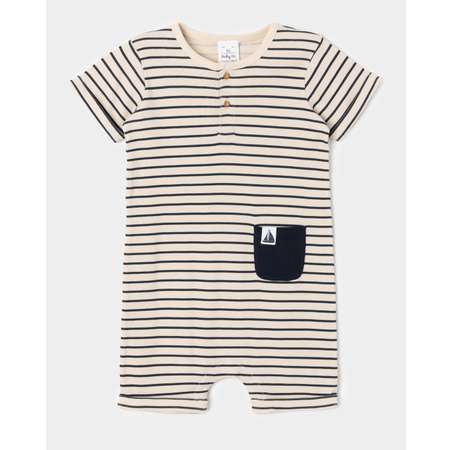 Полосатый песочник для мальчика BabyGо в бежевом цвете, с контрастным накладным карманом.