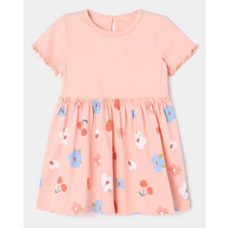 Розовое платье для девочки BabyGо с цветочно-ягодным принтом и волнистым кантом на рукавах.