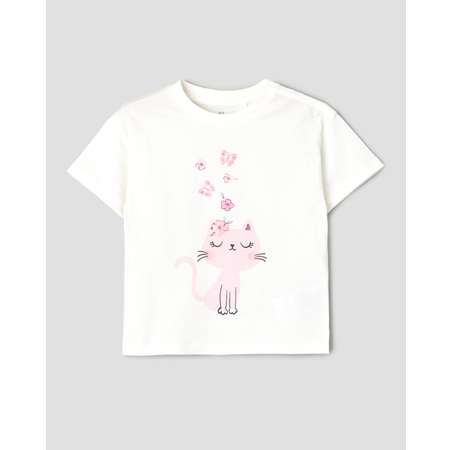 Белая футболка для девочки BabyGо, декорированная цветным принтом с блёстками.
