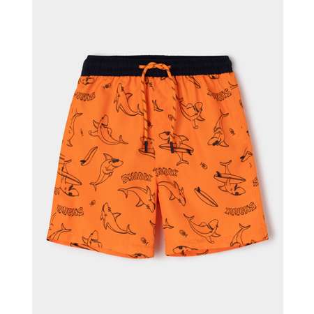 Купальные шорты для мальчика Futurino в неоновом оранжевом цвете, декорированные принтом с акулами.