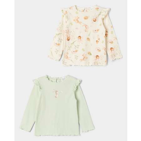 В комплекте BabyGо два лонгслива для девочки, декорированные оборками - зелёный и светло-бежевый с нежным цветным принтом.