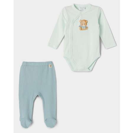 Комплект для мальчика BabyGo из голубого боди с очровательным медвежонком и синих ползунков с нашивкой.