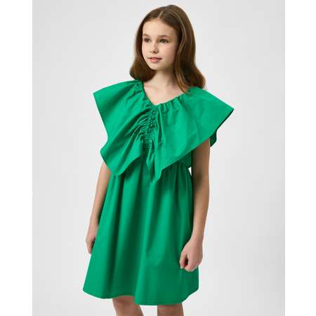 Зелёное платье для девочки Futurino с эффектным воланом от горловины и декоративной сборкой с двух сторон.