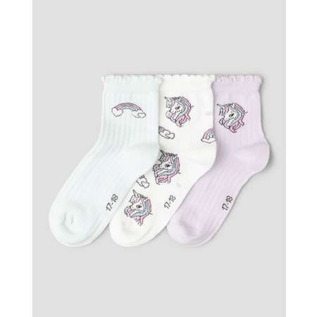 В комплекте Futurino три пары носков в рубчик для девочки, декорированных цветным принтом - сиреневые, молочные и светло-зелёные.