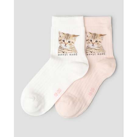В комплекте Futurino две пары носков для девочки, декорированных принтом с котиками "минус вайб" - белые и розовые.