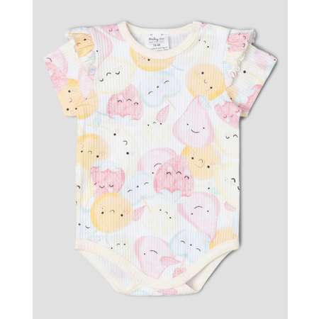 Боди для девочки BabyGо, декорированное оборками и забавным цветным принтом.
