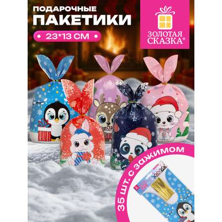 Пакет подарочный новогодний Золотая сказка пакетики для подарков и сладостей с зажимами набор 35 штук
