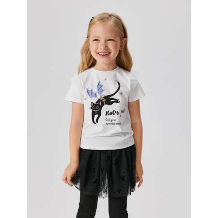 Детская футболка с котиком для девочки изготовлена из легкой и воздушной кулирной глади — хлопкового полотна, которое прекрасно подходит для повседневного ношения. Модель REGULAR fit предполагает традиционную посадку, отличающуюся прямым, чуть приталенным силуэтом и стандартной линией плеч. Белая футболка для девочки украшена легкими и воздушными оборками-крылышками из декоративной сетки, которые подчеркивают нужную девичью натуру. Спереди футболка украшена милым рисунком крылатой кошечки, глиттерными звездочками и надписью "HOLY CAT! | FEEL YOUR SPOOKY MOODS" [англ. - "Божечки-кошечки! | Ощути свое нагоняющее жуть настроение"]. Принт на водной основе не линяет и не трескается при стирках, а значит, будет долгое время радовать своими красками. Добавьте к футболке удобные леггинсы с юбкой (20220160442), чтобы создать стильный и утонченный образ на каждый день.