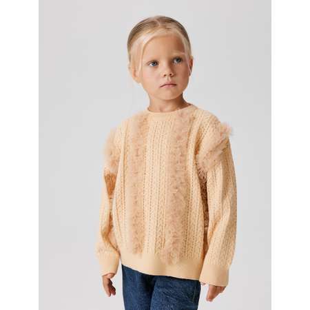 Детский вязаный свитер с рюшами для девочки выполнен из мягкой и теплой пряжи, что обеспечивает комфортное ношение в течение дня. Изделие свободного кроя со спущенной линией плеча позволяет создавать многослойные образы с надетой под низ рубашкой. Округлая горловина не мешает при одевании. Спереди расположены декоративные рюши из сетки, что придает изделию очаровательный и милый вид. Горловина, низ рукавов и самой модели выполнены в виде манжет, что обеспечивает лучшее прилегание к телу. Изделие представлено в двух цветах: светло-бежевом и фиолетовом. Стилизуйте свитер с джинсами, чтобы создать повседневный образ на прогулки с друзьями.