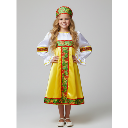 Платье стилизованное под народный сарафан с рубашкой, в комплекте идет головной убор в виде кокошника, фиксируется резинкой, отлично дополняет костюм и образ. Принт является уникальным и производится под заказ, есть размерная сетка. На спинке можно регулировать обхват под грудью поясом, на фото размер 128 на рост 120см.