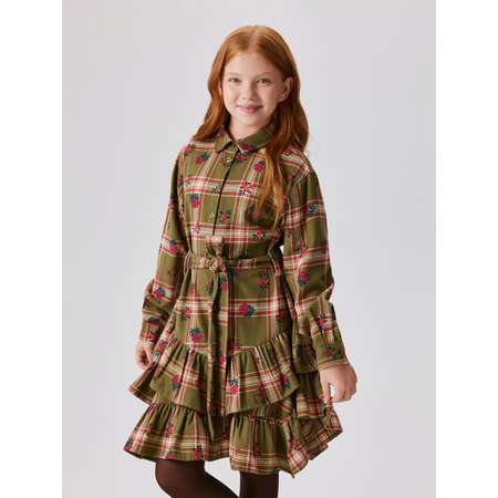 Детское платье в клетку с принтом цветов выполнено из мягкой и дышащей хлопковой ткани, которая обеспечивает комфортное ношение на протяжении всего дня. Платье свободного силуэта со спущенной линией плеча прекрасно подойдет для любительниц активных игр и беготни. Длинные рукава с манжетами на пуговицах делают платье подходящим для прохладной погоды. По центру груди расположена застежка на пуговицы и петли, которая облегчает одевание. Воротник придает модели завершенный вид. Платье отрезное по линии талии, с объемной многослойной юбкой, которая делает образ сложнее и придает ему визуального интереса. В комплекте идёт съемный пояс из основной ткани, для которого по линии талии нашиты шлевки. Платье в цветочек создаст нежный девичий образ и будет легко комбинироваться с разными видами обуви: от ботинок на шнуровке до балеток.