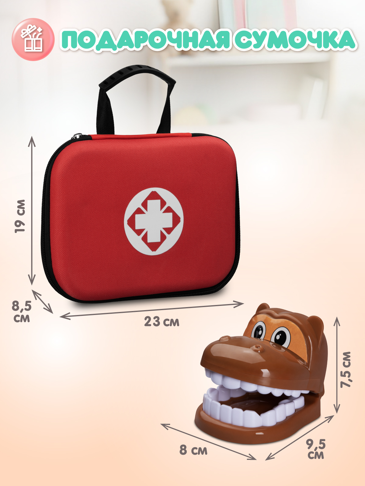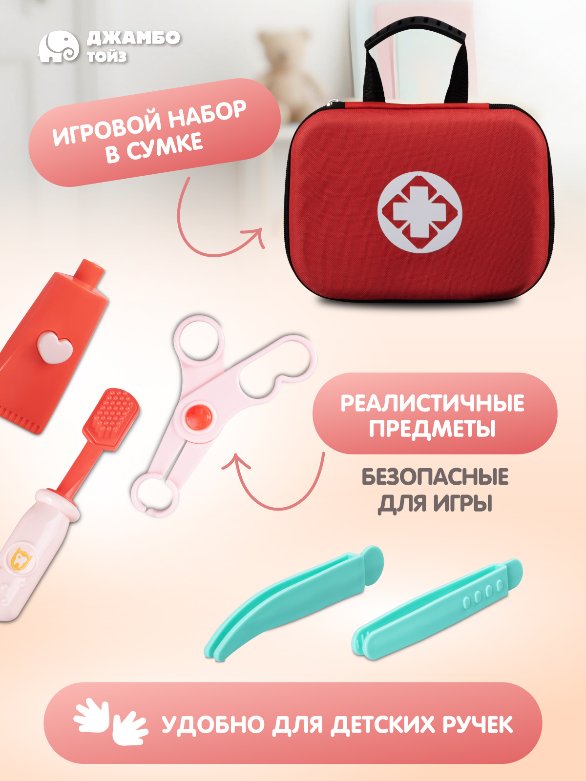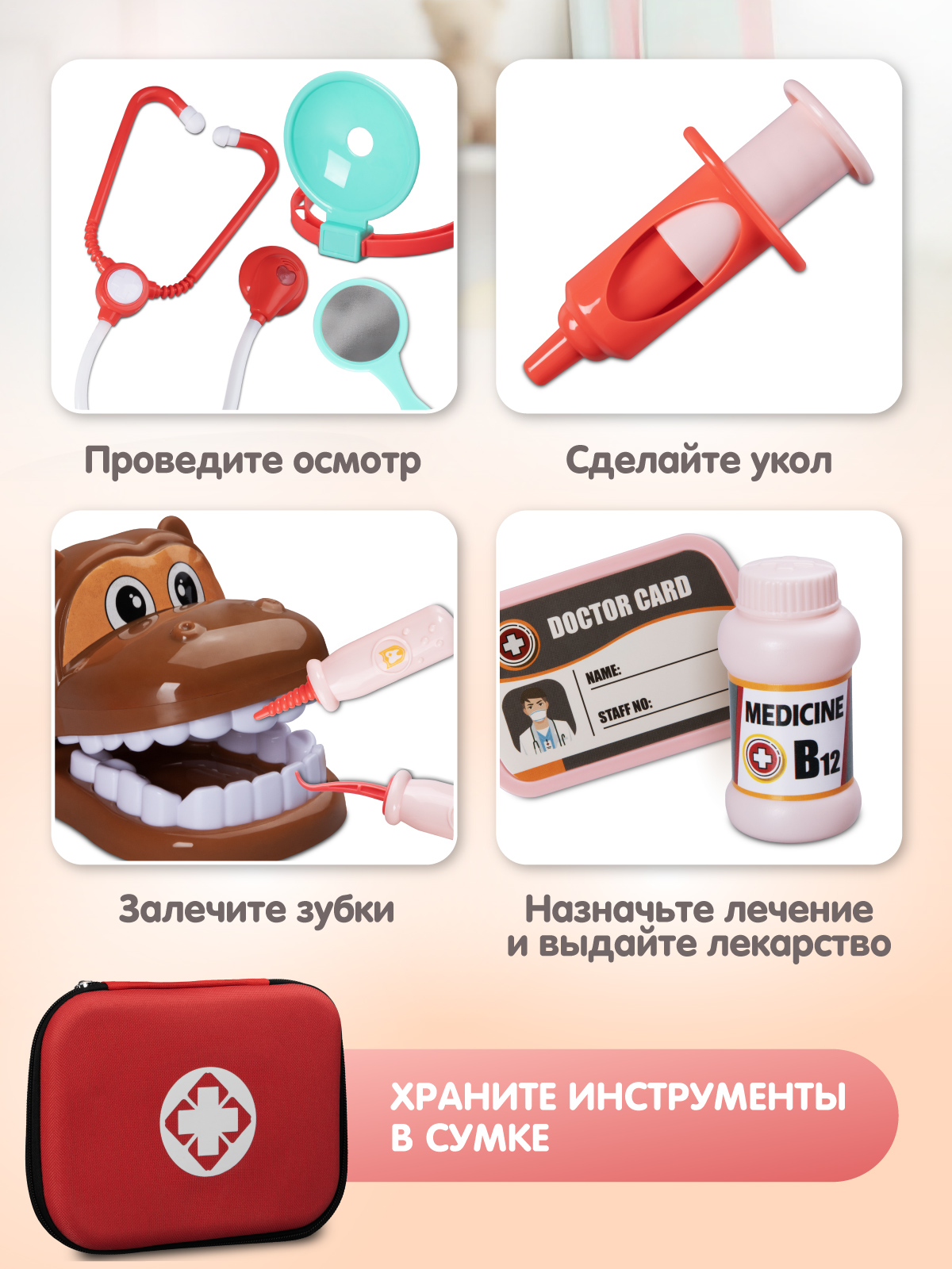 Детский набор доктора имеет все необходимые инструменты для увлекательной игры, позволяя ребенку почувствовать себя настоящим профессионалом. Набор удобно хранить и переносить благодаря вместительной сумке с ручкой. Из аксессуаров в набор входит: сумка, модель челюсти, очки, щипцы, зажим, пинцет, 2 скальпеля, шприц, лоток, стетоскоп, термометр, зеркальце, рефлектор лобный, бейджик, лопатка, зубная паста, сверло, зубная игла, зубная щетка, баночка. Детский игровой набор доктора изготовлен из качественной пластмассы, не содержащей вредных веществ, что крайне важно для здоровья ребёнка. Все элементы набора изготовлены без острых краёв и опасных механизмов, имеют удобные размеры, ими комфортно играть даже самым маленьким. Набор доктора полностью безопасен для детей, имеет необходимый сертификат и соответствует установленным требованиям. Интересный игровой набор для детей от 3 лет станет чудесным подарком для мальчиков и для девочек на любой праздник.
