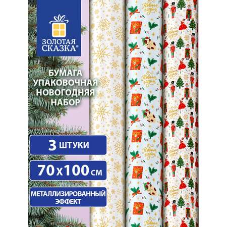 Упаковочная бумага Золотая сказка для новогодних подарков в рулоне 70х100 см набор 3 штуки