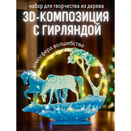 Объемное изображение собирается из деревянных деталей – и вот на вашем столе возникает зимний лес с заснеженными елями и прекрасными лошадками. Благодаря гирлянде композицию можно использовать как ночник.