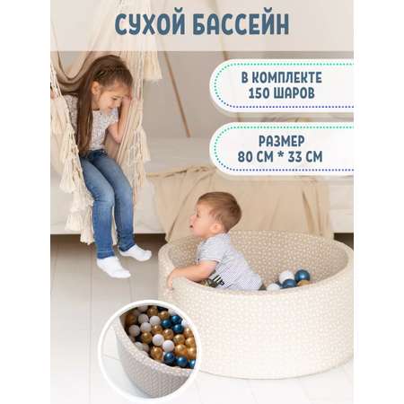 Детский сухой бассейн, диаметром 80 см и комфортной для малыша высотой 33 см выполнен из ткани интерлок, которая мало впитывает грязь и пыль. Толщина поролона, из которого сшит бассейн, составляет 4 см. Круглое поролоновое дно вставляется в потайное дно из ткани, благодаря чему шарики не забиваются под матрас во время игр, а поролон встает в распорку, усиливая мягкий каркас бассейна.