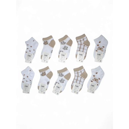 Подарите вашему малышу максимальный комфорт, стиль и яркое настроение с набором мягких детских носков! Изготовленные из натурального хлопка (95%) с добавлением эластана (5%), они идеально сидят на ножке, не сползают и не пережимают кожу. Эти носочки – идеальное сочетание милого дизайна и практичности, созданные специально для нежной кожи вашего ребенка. В наборе 10 пар укороченных носочков нейтральных и постельных оттенков, украшенных забавными мишками и трогательными сердечками, которые обязательно понравятся как мальчикам, так и девочкам.