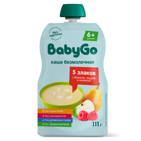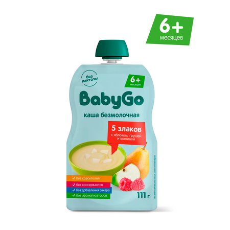Каша безмолочная BabyGo «5 злаков с яблоком, грушей и малиной» –вкусный и питательный завтрак или перекус для малышей. У каши нежная текстура и натуральная сладость яблока, груши и малины.