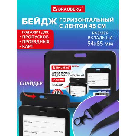 Горизонтальный бейдж BRAUBERG EXTRA размером 54х85 мм – идеальное решение для надежной идентификации сотрудников и участников мероприятий. Этот стильный чехол для пропуска выполнен из прочного пластика, защищающего вашу именную карту или бейджик от повреждений, что особенно важно для чувствительных магнитных карт. Комплект дополняет лента длиной 45 см с карабином, позволяющая использовать пропуск в школу и офис как вам удобно. Обратная сторона бейджа подготовлена для персонализации – фото, ФИО, должность и название компании легко разместятся в практичном формате. Такой бейджик для школьника и взрослого станет надежным аксессуаром, который защищает пропуска и удобно носится на шее, помогая всегда иметь на подвеске необходимые карточки. Этот чехол на пропуск и надежный бейдж – оптимальный выбор для ежедневного использования!