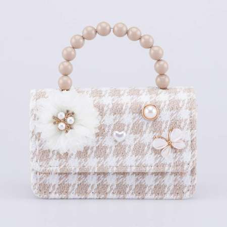 Маленькая сумочка кросс-боди для девочки, декорированная красивыми брошками, отлично дополняет образ юной модницы. Эта детская сумочка для девочки выполнена из фактурного материала твид.