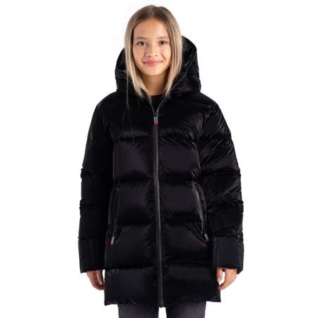 Стильная зимняя куртка из ткани черного цвета с водоотталкивающим покрытием из полиуретана, и матовым «бархатным» финишем, имеет утеплитель - искусственный пух весом 300г/м2. Оптимальная длина, цельный капюшон, внутренние манжеты и водостойкие молнии обеспечивают защиту от холода и ветра. Зимняя куртка декорирована контрастным принтом и брендированной фурнитурой.