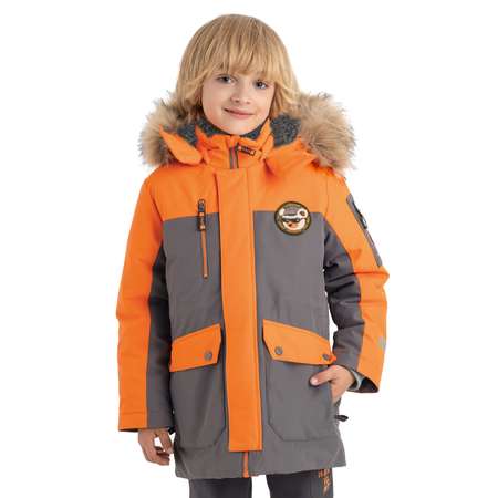 Зимняя двухцветная удлиненная куртка для мальчика из влагозащитной, грязеотталкивающей, не продуваемой мембранной ткани 5000мм/5000г/м2/24ч, имеет утеплитель 300г/м2. Куртка дополнена подкладкой из шерпы в капюшоне, воротнике и верхней части изделия. Съемный капюшон имеет регулируемую кулису по краю, и декорирован отстегивающимся мехом. Высокий воротник, манжеты из риба и ветрозащитная планка на липучках надежно защищают от ветра. Куртка имеет два накладных кармана, функциональные карманы на груди и рукаве, и светоотражающие принты сзади и на рукаве для защиты ребенка в темное время суток.