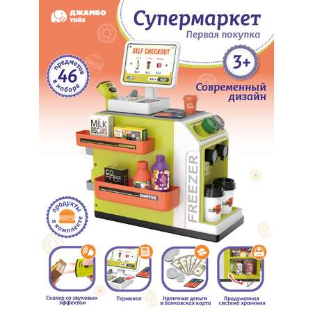 В комплект входят: большой игрушечный прилавок с вывеской и полочками, кофейный аппарат, касса с игрушечным POS-терминалом и сканером, всевозможные продукты, а также игрушечная кредитная карта и игрушечные деньги.